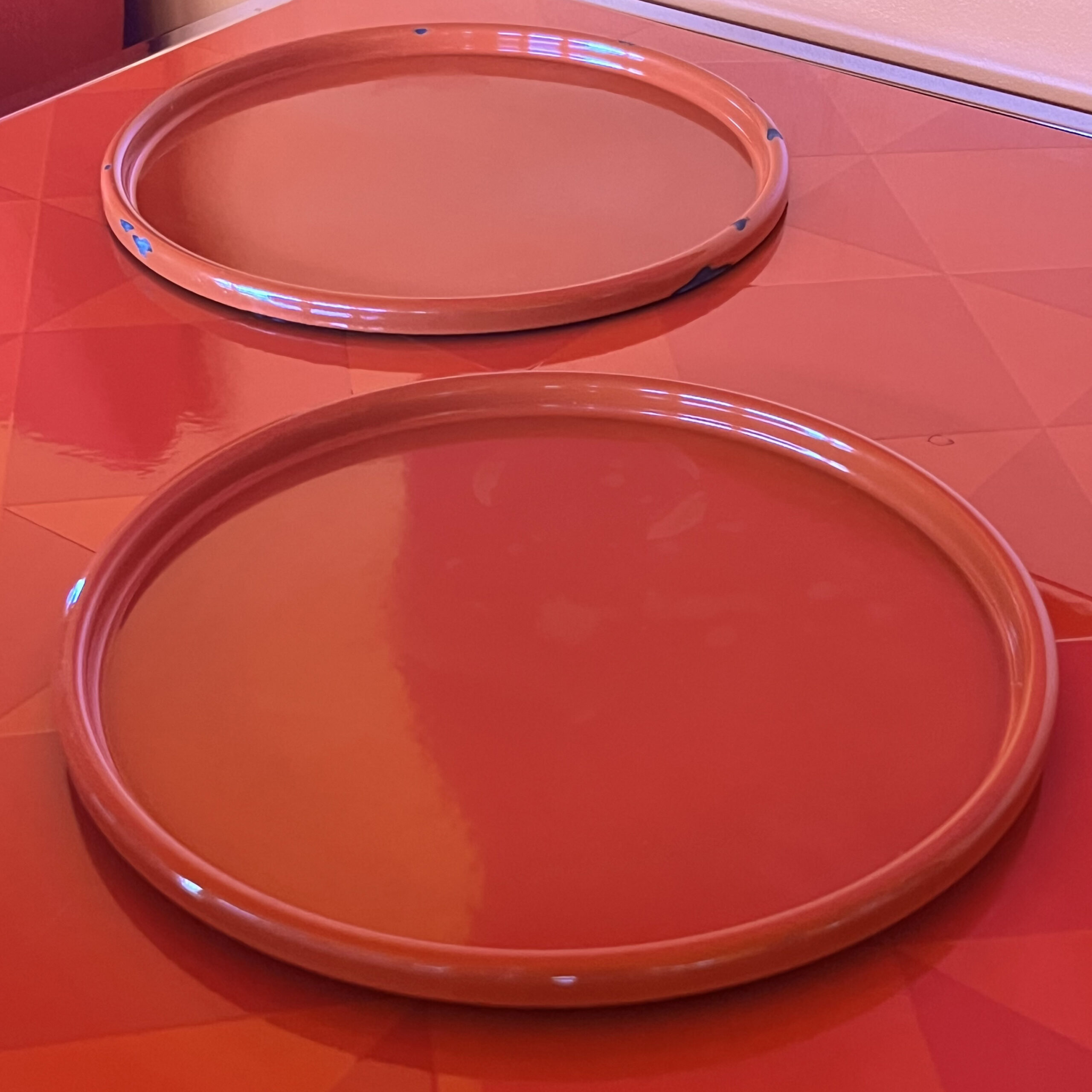 Remarks: Only remaining round table from “Salon Rouge” wich was the staff cantine at Emaillerie Corgémont who made Verner Pantons enamel objects. Verner Panton designed a special interior for this place wich also worked as a showroom. Walls, ceilings, lamps and tables was in red enamel. The floor had a red wall-to-wall carpet.